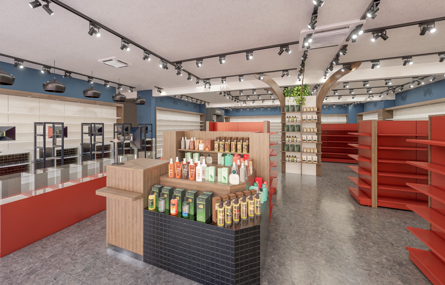 Comptoir pharmacie gondole de maquillage et médicaments